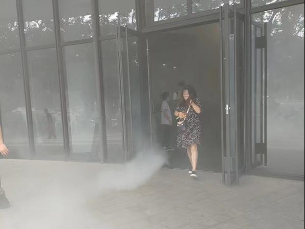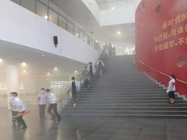 15时50分大学生活动中心二楼某办公室突发“火警”,不一会二楼及三楼楼道烟雾弥漫,引发烟雾系统报警,顿时整栋大楼漆黑一片,正在办公的师生有的镇定自若,有的慌不择路。“这里是值班室吗?大学生活动中心发生‘火灾’,现在有人被困电梯,请抓紧救援。”“救援指挥部”接到报警后,仔细询问了报警人火灾详情,迅速展开调度协调工作。只见灭火小组接到指令后带着装备做起了最美逆行者迅速展开“灭火”,疏散引导小组使用扩音器引导大家疏散逃生,并不时纠正逃生不规范行为,在此期间被困电梯人员顺利“解救”出来……
