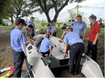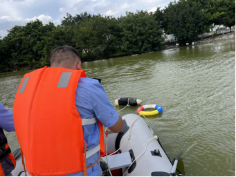 作为一名曾在海上服役多年的退伍老兵,黄光电对于水上救生设备和救生流程再熟悉不过。演练伊始,他带着大家一起给救生艇充气,做好前期准备工作,由于天气炎热,不一会,参与人员已汗流侠背。“在水上实施救援过程中,施救人员要注意施救方法和技能,首先要将救生圈或其他有漂浮力的如木头等扔给落水人员;二是施救人员要从背后拉住或抱住对方,千万不能面对面去抱,因为落水者的求生本能会死死抱住施救人员,这样不但不利于救援,甚至会将施救人员一起拖下水。”黄光电讲解到。