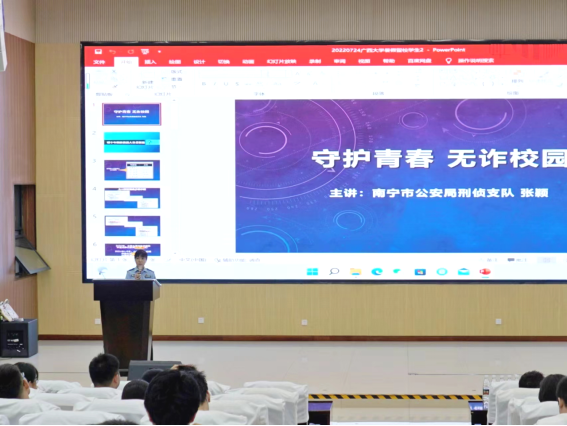 为有效预防电信诈骗,提高暑假留校师生员工防诈反诈意识,7月23日、24日,保卫处联合南宁市公安局刑侦支队、西大派出所深入我校朴诚后勤公司、物理科学与工程技术学院、资源环境与材料学院等单位开展“守护青春,无诈校园”主题反诈宣传讲座活动。
