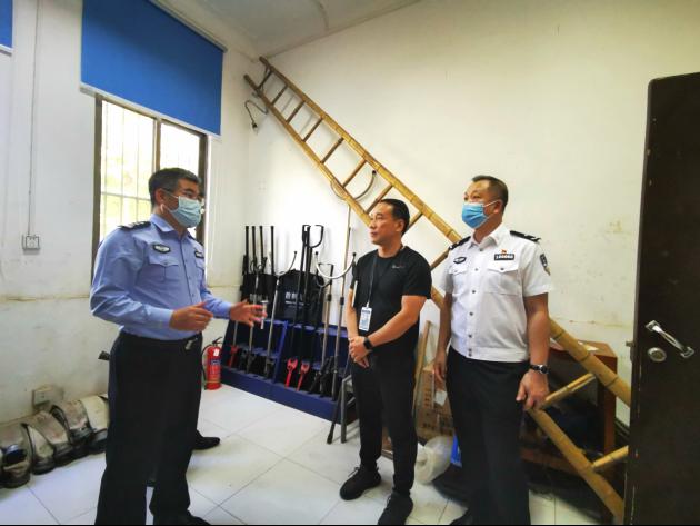 会前,庞武副总队长一行现场考察了保卫处器械室,对反恐防暴、消防应急处置等安保器材进行了详细了解并作出专业指导。
