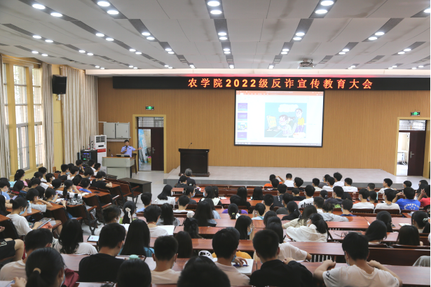 10月18日下午,校保卫处、南宁市公安局西大派出所到农学院召开2022级新生反诈教育宣讲会,西大派出所韦振豪教导员进行主讲。农学院本科生、研究生700多人分批次参加。