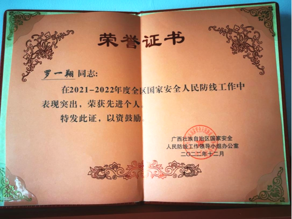 12月16日,自治区国家安全人民防线先进单位和先进个人表彰大会在邕召开,我处罗一翔处长荣获“2021-2022年度全区国家安全人民防线先进个人”称号。(吕丽华/文图)
