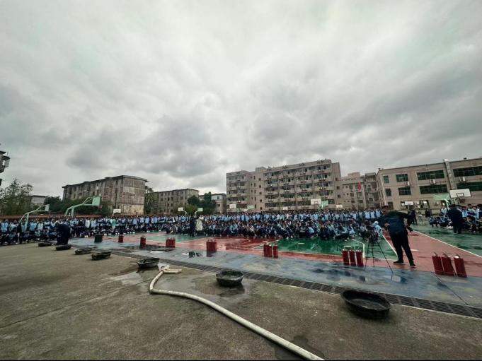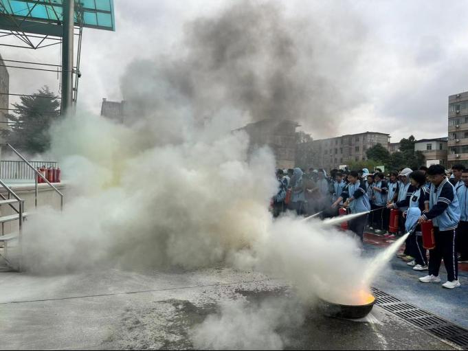 (附中全体师生员工进行消防器材灭火实操演练)