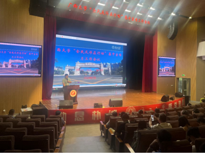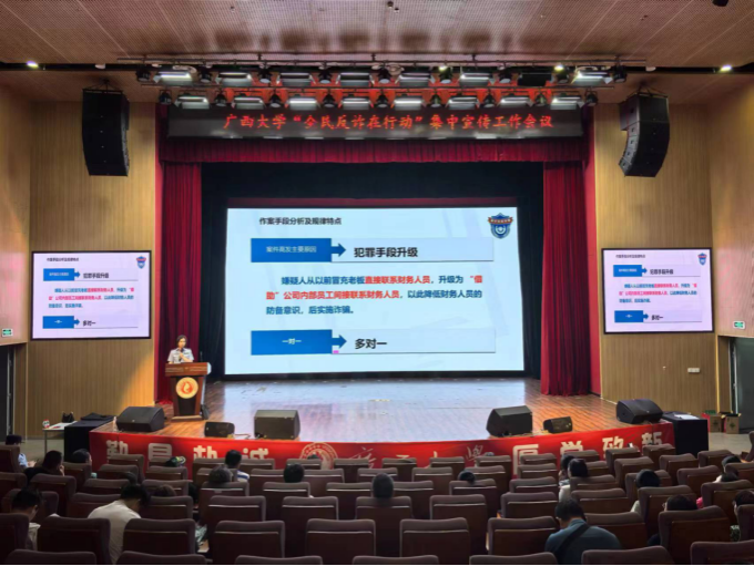 为切实保障师生员工财产安全和校园稳定,有效遏制我校诈骗案件高发态势,7月9日下午,我处组织召开“全民反诈在行动”集中宣传月工作会议,南宁市公安局西乡塘分局反诈中心民警受邀出席会议。