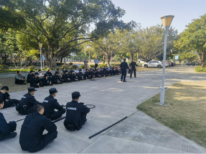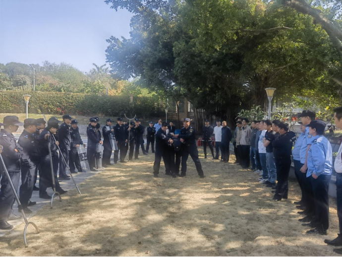 演练前,特巡警大队梁伟钦教导员对我处安保人员开展业务技能培训,现场演示了警棍、盾牌、钢叉等器械的使用方法和注意事项,并进行现场实操演练,实地讲解校园安保人员面对暴力恐怖活动袭击时的应急处置方式。