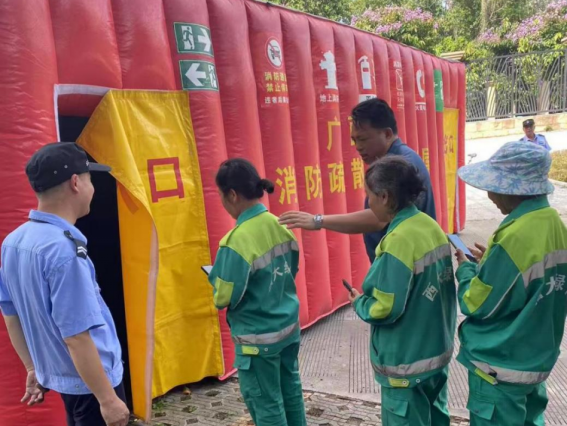 紧接着是消防应急疏散演练,创新性引入疏散逃生体验屋模拟真实火灾环境。物业工作人员置身其中,亲身体验浓烟弥漫、视线受阻的紧急场景,在引导员的指挥下,弯腰低姿、捂住口鼻,迅速而有序地疏散至安全区域,切实提升应急逃生技能。