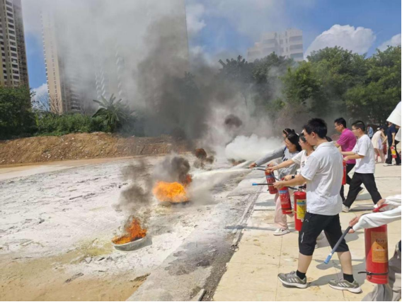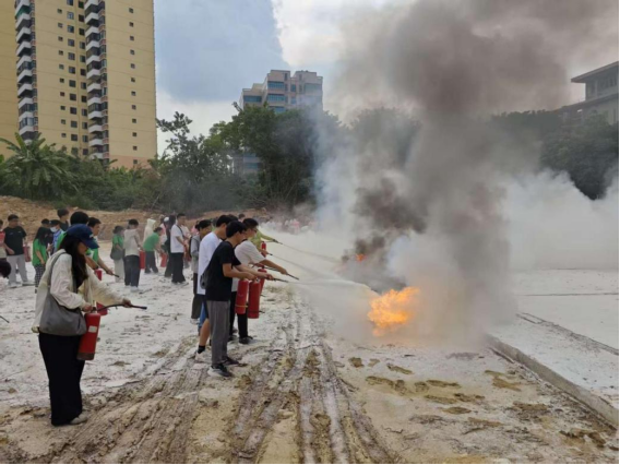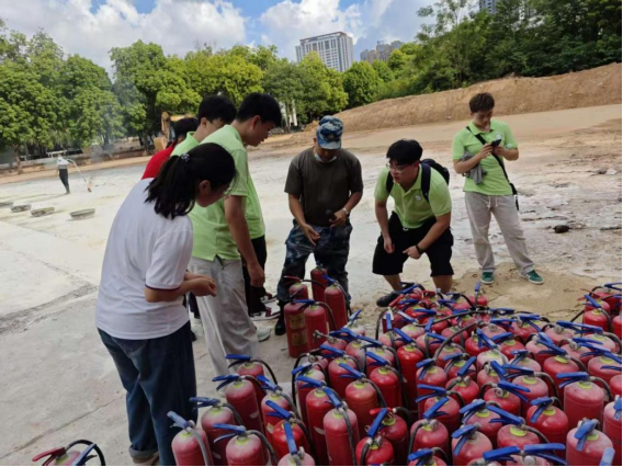 讲解结束后,灭火实操演练随即展开。工作人员在指定区域点燃模拟火盆,新生以小组为单位依次上前,在专业指导下亲手拿起灭火器,按照讲解步骤完成拔销、对准、按压等动作,亲身参与灭火操作。从最初的紧张生疏,到逐渐熟练掌握技巧,新生们在实战式演练中反复练习,切实体会灭火器使用要领,有效攻克“只懂原理、不会操作”的短板,真正将灭火技能转化为自身应急能力。