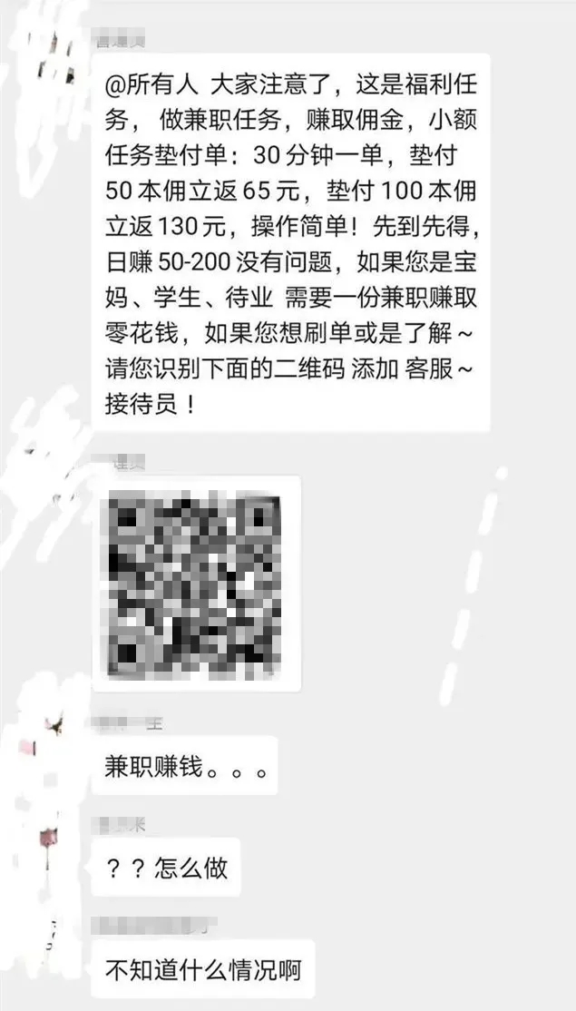 看明白了吗?敢情绕这么一大圈,就是“兼职刷单诈骗”。这才是他们拢人的真正目的。这时群里的托也开始说话了,目的就是骗那些没接触过刷单的小白。