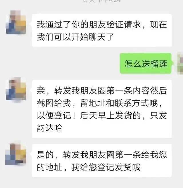因为是朋友发的,很多人就觉得不能是假的,免费的礼品不要白不要,于是扫二维码添加客服微信。你问客服榴莲怎么领?客服说,转发他朋友圈第一条内容,再截图给他就能领。