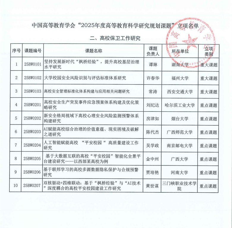 以下为附件中有关“高校保卫工作研究”的课题