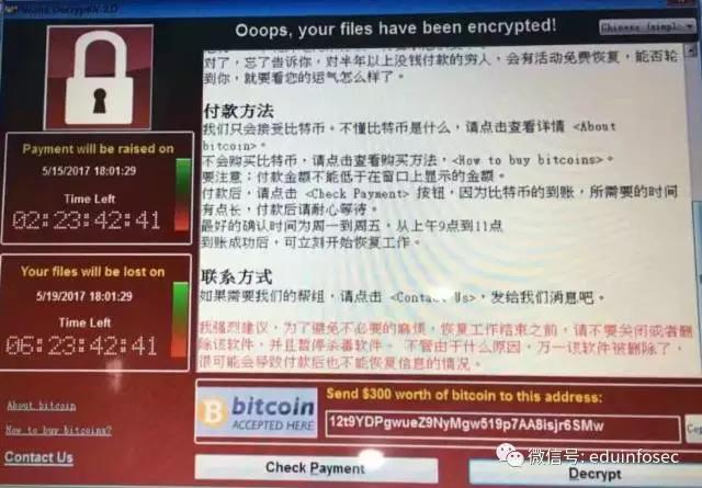 相关报道:这种病毒全球大爆发!昨晚全国多所大学校园网被黑,学生收到一封信:想解锁,请付300美金等价比特币……