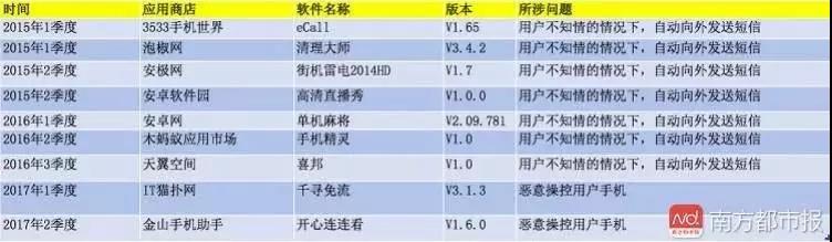 其中多数是通讯类的应用软件,比如2016年3季度,在安卓商店检测发现问题的“网易通省钱电话”(V1.0.0)和“UU电话”(V3.5.4)。