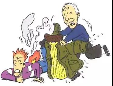 身上着火,千万不要奔跑,应赶紧设法脱掉衣服或就地打滚,压灭火苗;能及时跳进水中或让人向身上浇水就更有效了。