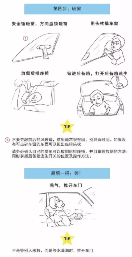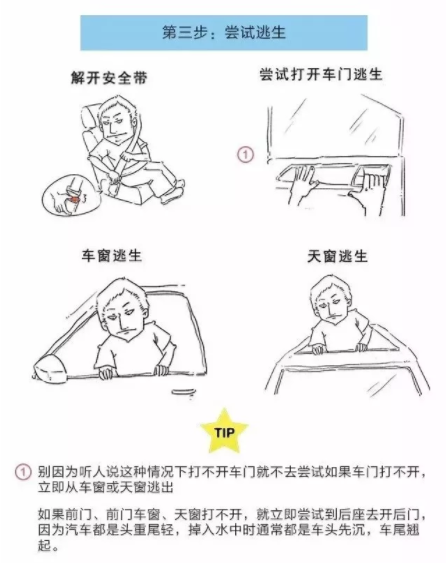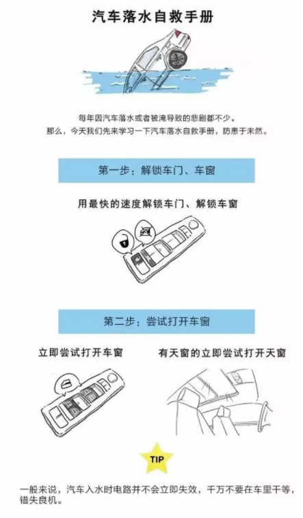 记住:遇到汽车落水千万不要惊慌,一定要保持冷静,然后按照上面的方法积极自救。