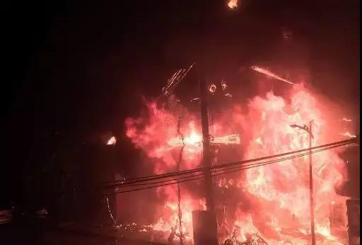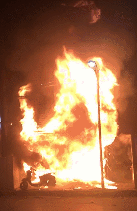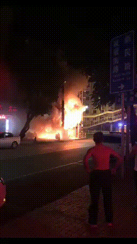 据了解,大火是从该居民楼一楼门面卷帘门内开始烧起。约十分钟后,火势渐渐蔓延变大燃起熊熊大火,店铺招牌也被吞噬,大火还引燃停放在路边的两辆电动自行车。