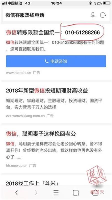 发觉被骗后,刘先生心里慌乱不已,急于追回自己的损失,就在UC浏览器搜索微信客服电话。他拨打了搜索结果第一条的010开头的“微信被骗全国统一电话”,电话接通后,接线人员让他添加“微信团队”公众号,留言“申请退款”,要求他从银行卡转入1万元保证金到微信零钱内,才能追回损失的3289元。接着,刘先生又听信对方,添加一个名为“处理相关问题”的微信号,按要求试一下转账交易是否正常,结果输入验证码后,1万元直接转给了对方。结果,他再次被骗,再打电话过去,骗子马上挂断了电话。