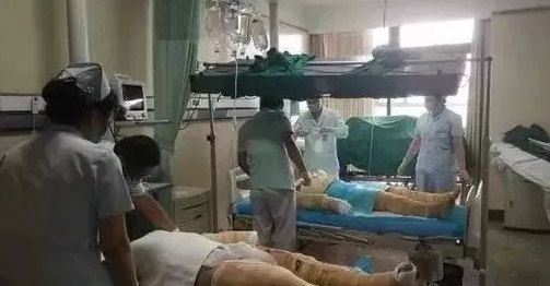 据医生介绍,两名伤者全身烧伤面积在80%-90%左右,其中一个40多岁,另一个50多岁,以深二度到浅三度为主,伴有吸入性损伤,且面部、手部、头部皆有爆震伤,病情严重。医生说:“对于大面积烧伤来说,肺脏为第一靶器官,两名患者头面颈烧伤、全身肿胀明显,为了预防肺部并发症,我们将马上进行预防性气管切开手术。”