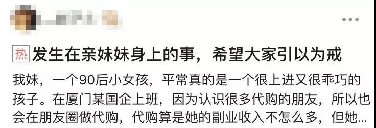 帖子称,妹妹是个90后,平常很上进又乖巧,在福建厦门一公司上班,因为认识很多代购的朋友,所以也会在朋友圈做代购,代购是她的副业,收入不多,但她说能多一份收入是一份,女孩的上进让家人欣慰。