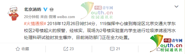 26日10时40分,@北京消防官方微博发布消息称:#火情通报#2018年12月26日9时34分,119指挥中心接到海淀区北京交通大学东校区2号楼起火的报警,经核实,现场为2号楼实验室内学生进行垃圾渗滤液污水处理科研试验时发生爆炸,目前消防部门正在全力处置。