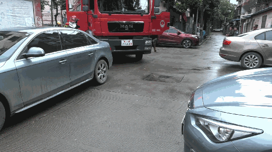 从消防车进入小区到被三辆私家车逼停