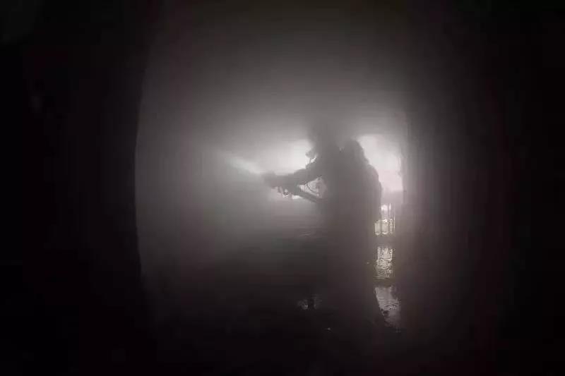 消防员铺设完水带出水灭火