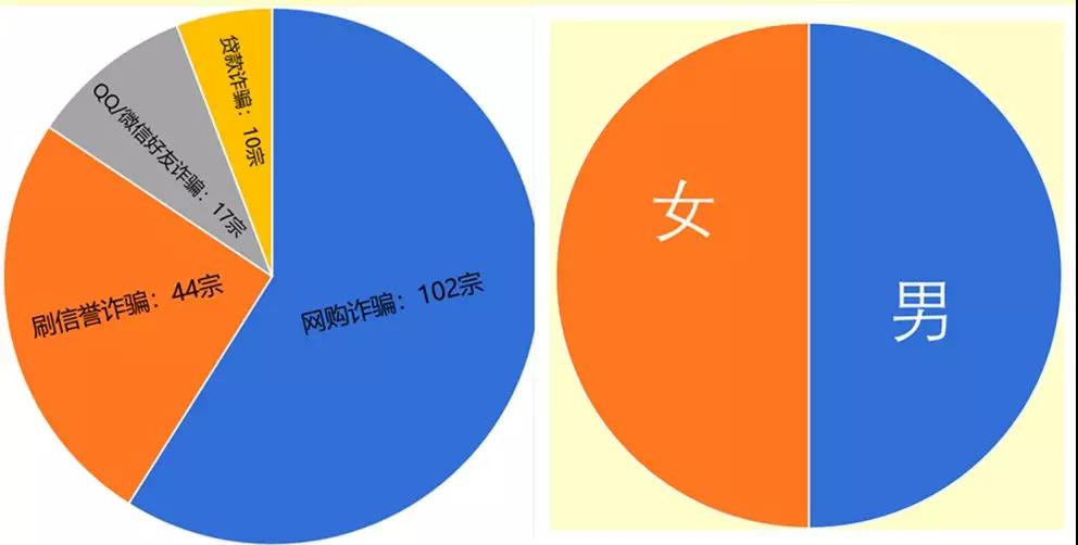 其中,以网购和刷单诈骗占比最大,受害学生男女比例基本持平。