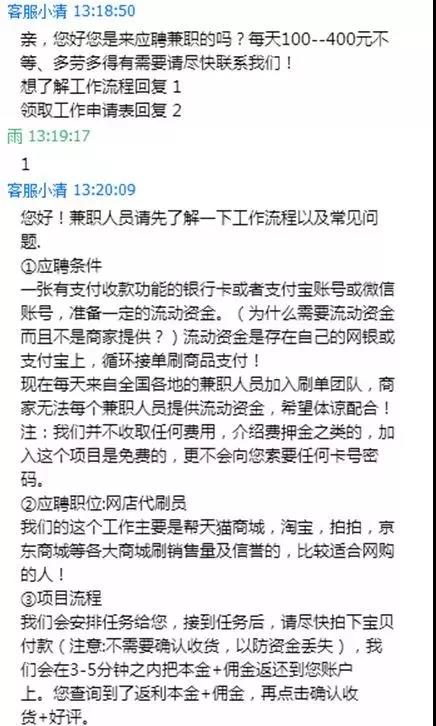 “*宝商家代刷员,家中工作即可,一单一结,绝不拖欠,咨询q:XX,限XX人。”