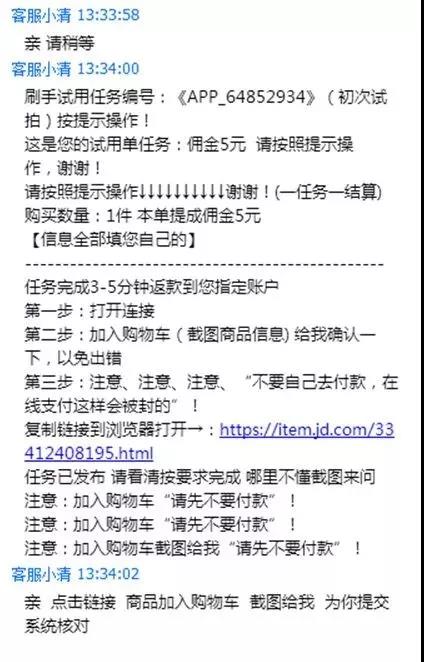 被害人手机收到有关“兼职广告”的短信和链接,主动添加骗子在短信或网络中预留的社交软件,填写个人简历和各种申请表,并拍下骗子在电商平台指定的商品付款刷单,很快就会收到少量的刷单返现,在赢取被害人的信任以后,要求被害人在不同的电商平台内拍下指定商品刷单,然后以“系统故障”、“刷单延时”等理由要求被害人反复多次刷单,后被害人申请退款没有回应方知被骗。