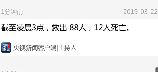 据央视,截至今天凌晨3点,江苏响水一化工厂爆炸火势已被控制,消防共从现场搜救出88人,其中12人死亡。