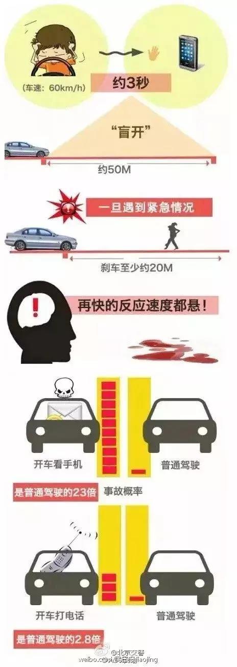 开车看手机,引发事故的概率是普通驾驶的23倍。为自己和别人的安全,开车不要看手机!低头3秒,相当于盲开约50米;这时如果遇到紧急情况,从眼睛看到异常路况,反应到大脑,再从大脑指挥刹车,到完成刹车,大概要0.7秒,时速60公里的车也已前行很多。再快的反应速度都悬!