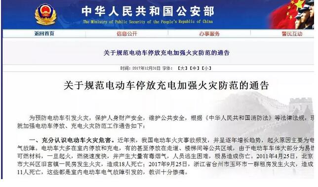 因此,公安部2017年12月下发了《关于规范电动车停放充电加强火灾防范的通告》,
