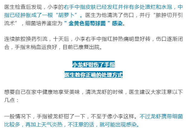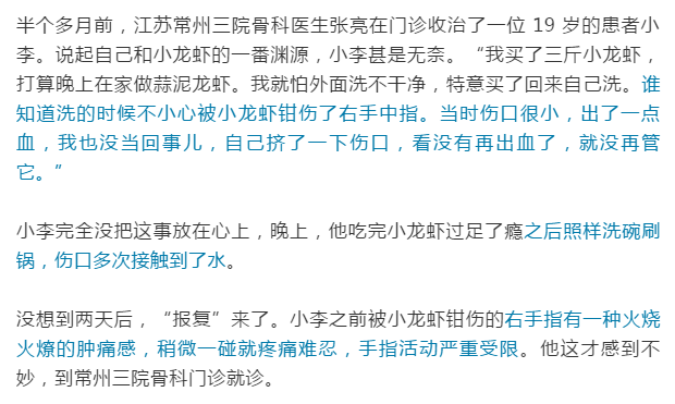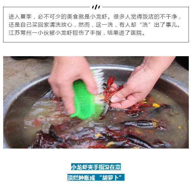 吓人|大意不得!与小龙虾“握”了个手,小伙手指溃烂肿成“胡萝卜”!