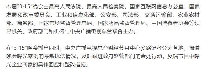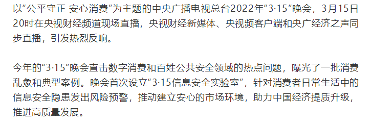 《2022年3·15晚会》回放链接地址:https://tv.cctv.com/2022/03/15/VIDE6KrFuP2OKvJ8SorYpwpJ220315.shtml?source=search