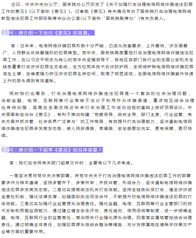 国务院联席办有关负责人解读《关于加强打击治理电信网络诈骗违法犯罪工作的意见》