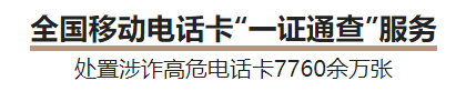 针对部分群众身份信息被诈骗分子冒用办理涉案电话卡等情况,工信部推出全国移动电话卡“一证通查”服务,截至今年4月底,用户查询量已累计突破6700万次。同时,集中排查处置涉诈高危电话卡7760余万张、行业卡1930余万张,清理关联互联网账号5700万余个,对全国物联网卡开展拉网排查,一大批存量高危号卡得到全面清理。