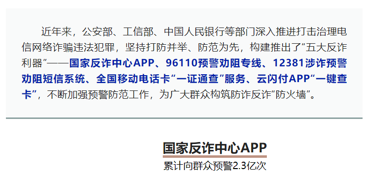 2021年3月15日,公安部推出的国家反诈中心APP正式上线,截至目前已受理群众举报线索1460余万条,向群众预警2.3亿次,在防范电信网络诈骗工作中发挥了重要作用。