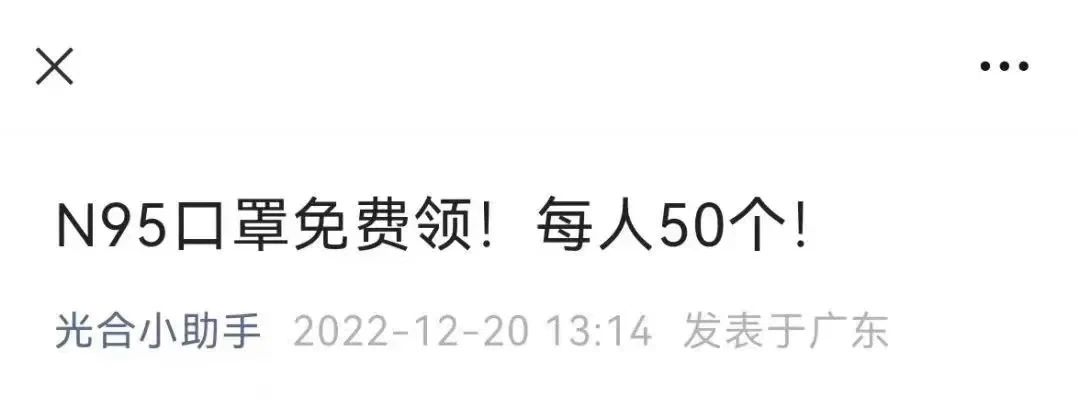 12月20日,一篇非官方发布的推送《N95口罩免费领!每人50个!》,在深圳市民的朋友圈内广泛传播,引发关注。推送中称,填写相关信息后即可免费领取N95口罩。