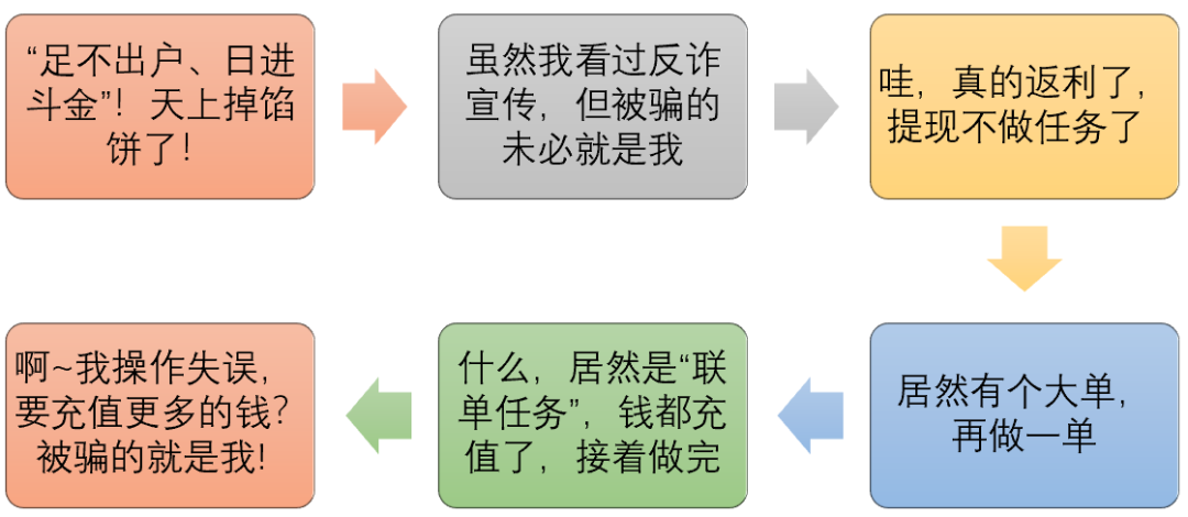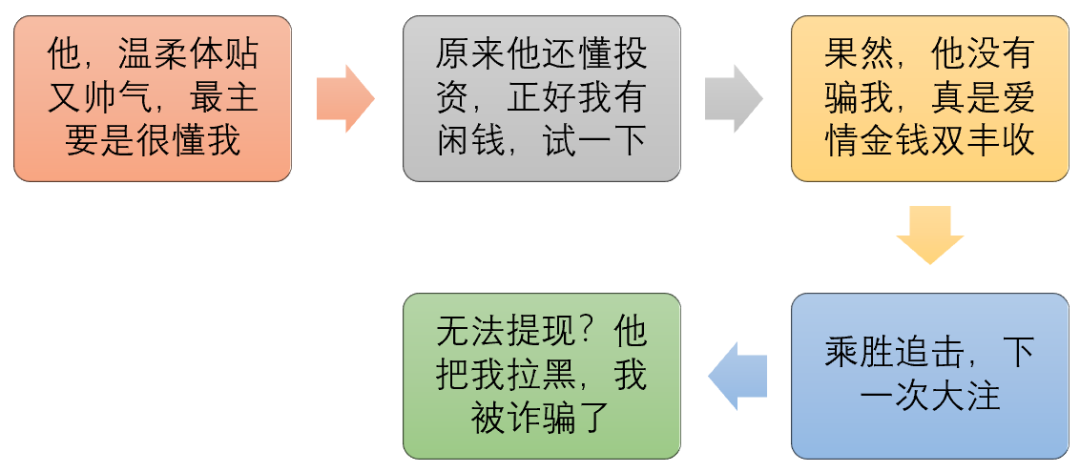 施以小利,诱骗上钩,放小抓大,最后拉黑走人。