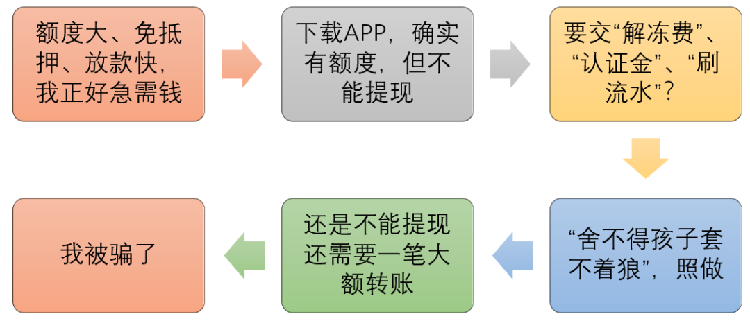网络贷款诈骗:以无抵押、低息、放款快,让你觉得仿佛天上掉馅饼一般,逐步按照对方所说的去操作,最终越陷越深。