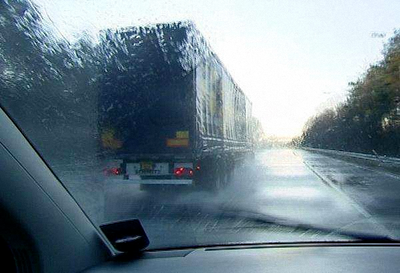 大型车在雨天行驶会给小型车辆带来很多潜在的危险,小型车辆要远离它们。