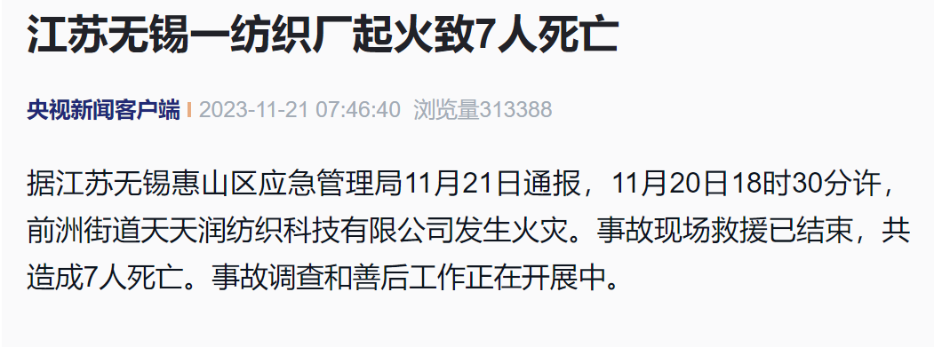 11月20日18时30分许,江苏省无锡市惠山区前洲街道天天润纺织科技有限公司发生火灾,造成7人死亡。事故调查和善后工作正在开展中。