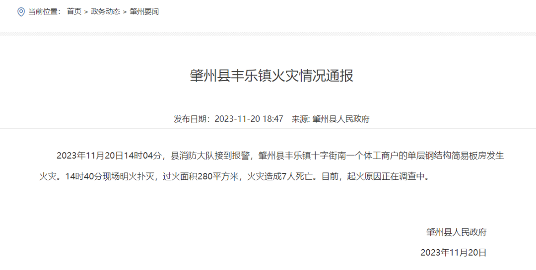 11月20日14时04分,黑龙江省大庆市肇州县消防大队接到报警称,肇州县丰乐镇十字街南一个体工商户的单层钢结构简易板房发生火灾,过火面积280平方米,造成7人死亡。目前,起火原因正在调查中。