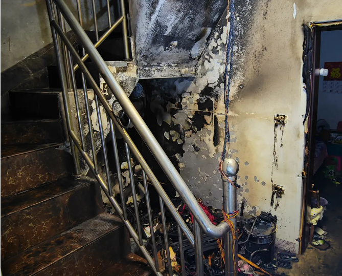 引燃一楼楼梯间可燃物所致