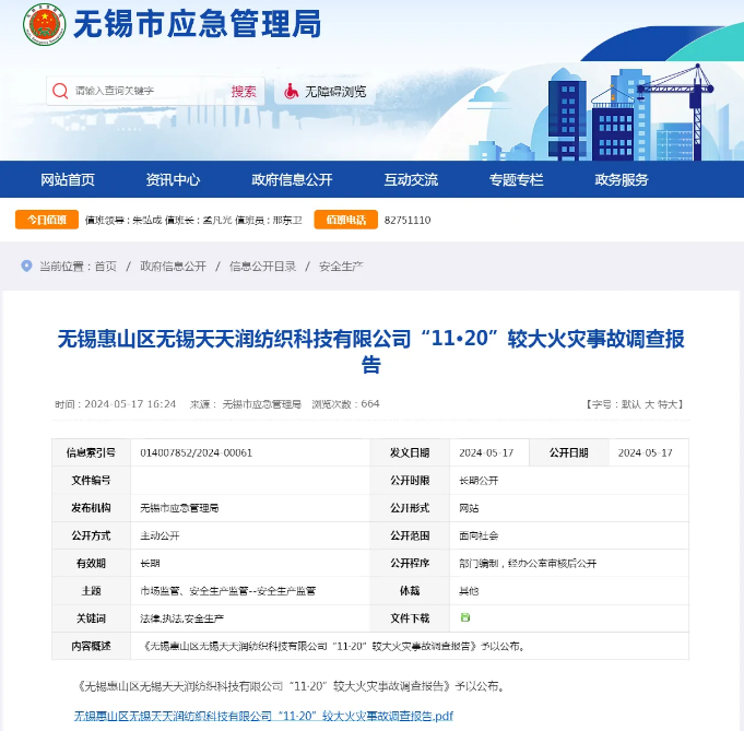 近日,无锡市应急管理局网站公布了《无锡惠山区无锡天天润纺织科技有限公司“11·20”较大火灾事故调查报告》。