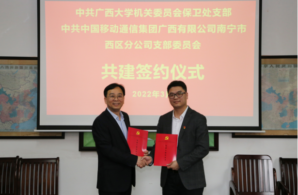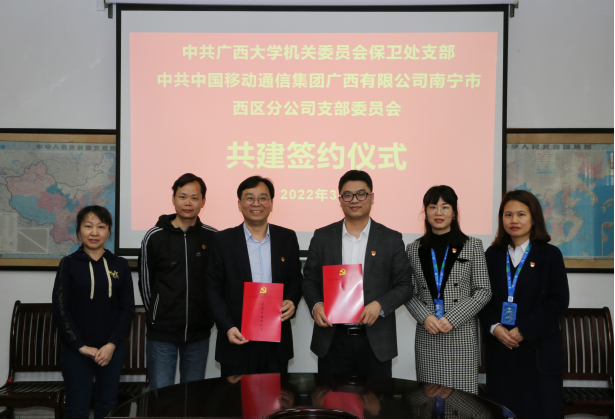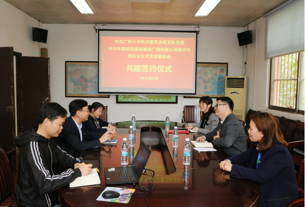 为深入推进“支部共建”和“党建和创”工作,积极履行社会责任,3月10日下午,我支部与中共中国移动通信集团广西有限公司南宁市西区分公司支部委员会举行支部共建签约仪式。西区分公司支部委员(副总经理)文靖、我支部书记(处长)罗一翔出席仪式,双方支委有关党员同志参加。